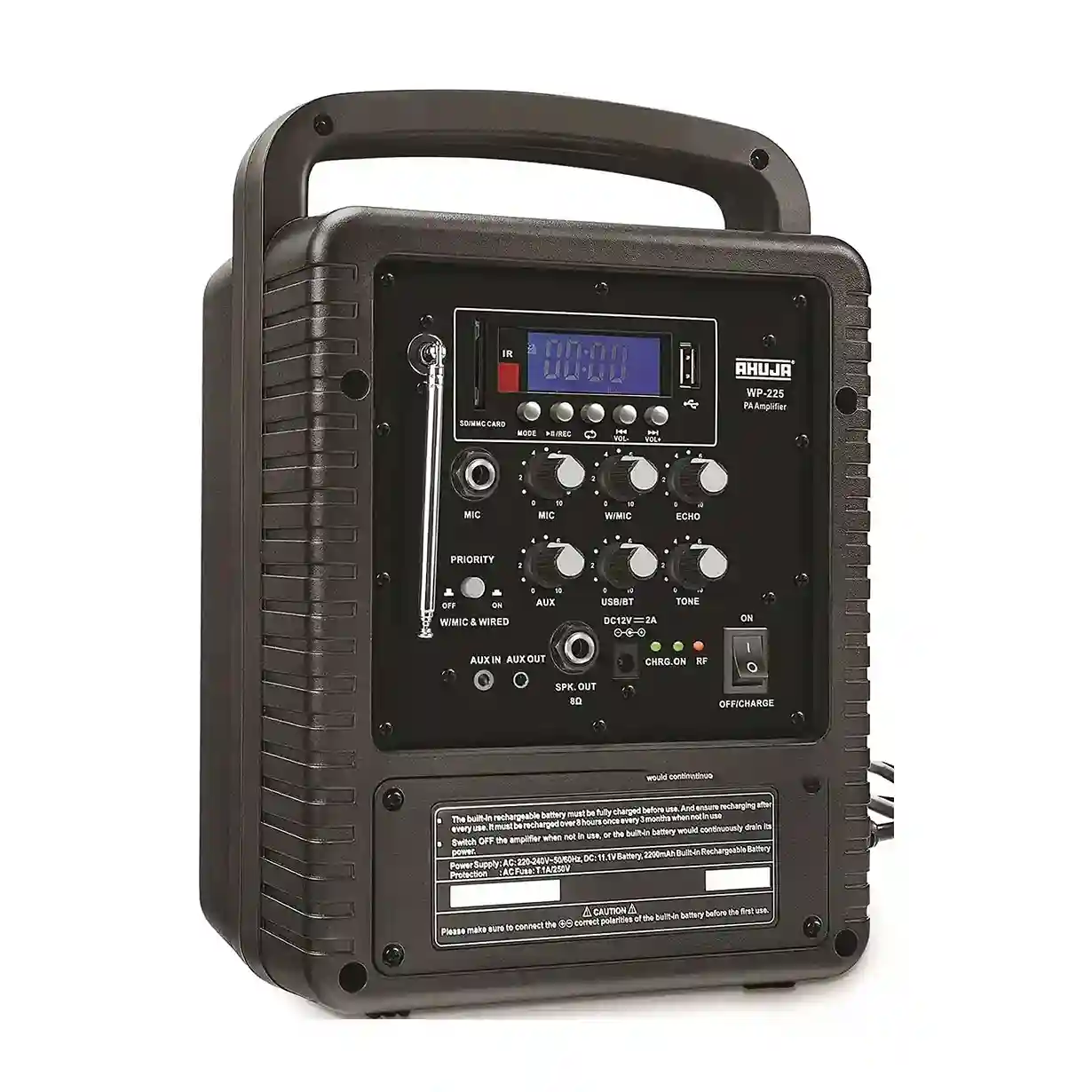 The Ahuja WP‑225 Portable PA Speaker is a highly versatile and compact public address system, designed for teachers, presenters, event organizers, and small gatherings. Despite its lightweight design (just 2 kg), it delivers crystal-clear 20W audio output, making your voice, announcements, or music loud and easily audible in classrooms, small halls, offices, or outdoor spaces. This speaker is perfect for schools, colleges, temples, mosques, offices, and community events, providing high-quality sound in a portable package. Its built-in rechargeable battery ensures you can use it anywhere, whether you’re indoors or outdoors, without worrying about access to AC power. The WP‑225 is engineered for ease of use, portability, and reliable performance, making it an ideal companion for all your audio needs.