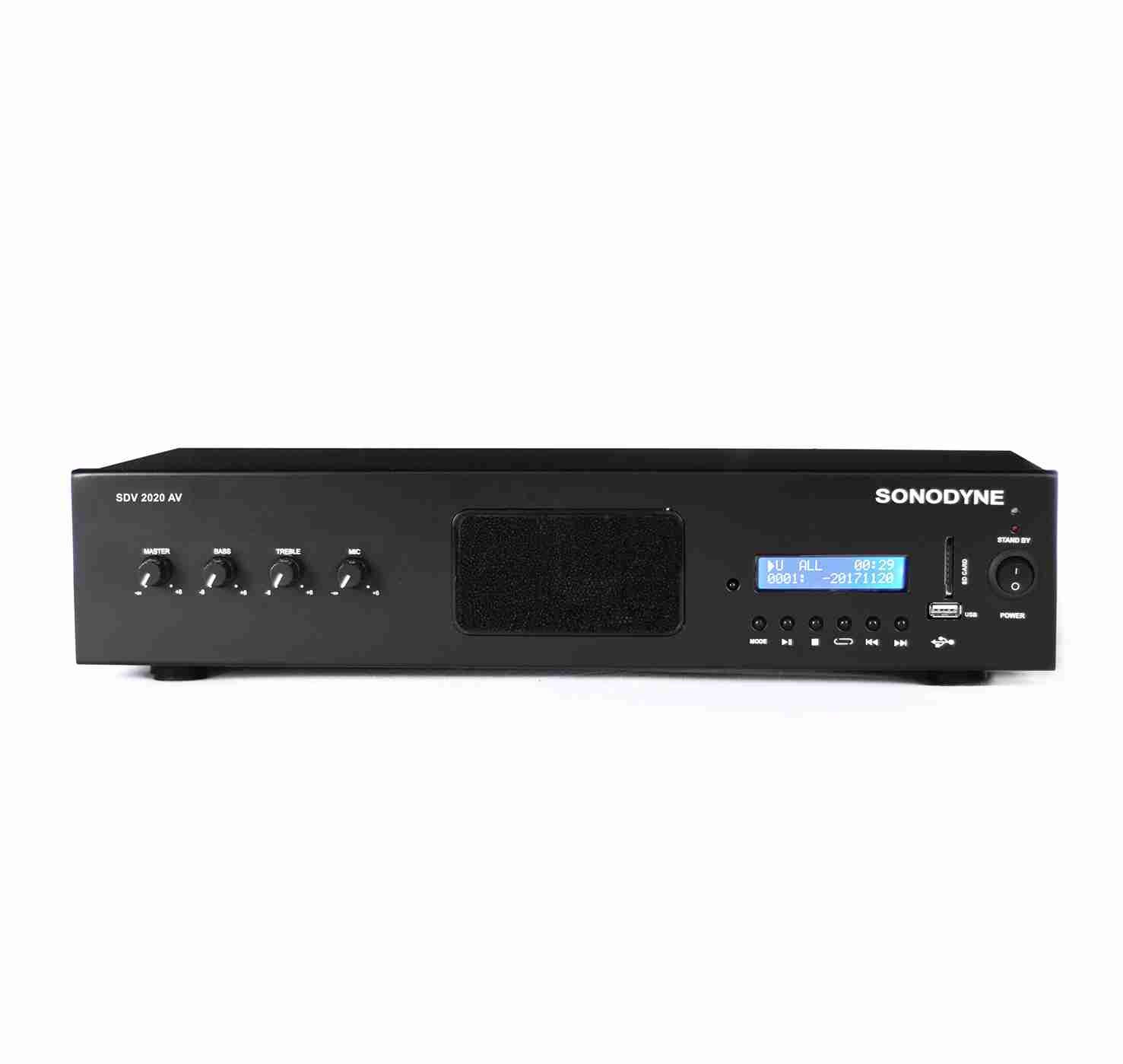 The Sonodyne SDV 2020 Integrated Amplifier is a high-performance Class-D amplifier designed for professional audio installations across India. Delivering up to 2 × 200W power at 4Ω, this amplifier offers clean, detailed, and distortion-free sound for commercial, corporate, institutional, and retail applications .Built with a high-efficiency SMPS power supply, advanced protection circuitry, and versatile input options including balanced Euro block, RCA, mic input, USB, SD card & Bluetooth, the is engineered to offer maximum flexibility for modern audio setups. With its rugged build, fan cooling, and superior performance, the becomes the perfect choice for auditoriums, classrooms, offices, hotels, cafes, conference halls, gyms, houses of worship, and PA systems.