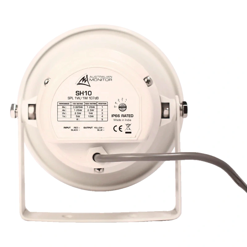 The Sonodyne SH10 Horn Speaker is a professional-grade 10W outdoor PA speaker designed for clear voice projection and reliable performance in all weather conditions. With its IP66 rating, it is completely dust-tight and waterproof, making it ideal for outdoor installations such as factories, schools, stations, warehouses, temples, public areas, and large open spaces.Built with a durable aluminium flare and UV-stabilised ABS housing, the SH10 ensures long-term durability under India’s harsh outdoor conditions — from heavy rains to extreme heat. It offers multiple power tap options (10W, 5W , 2.5W ,1.25W) and supports 8-ohm direct connection as well as 100V line systems, giving flexibility for commercial audio and paging installations.