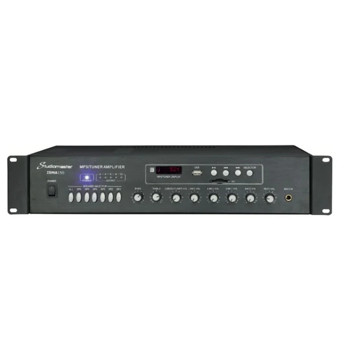 The Studiomaster ISMA150 is a powerful and reliable 150W 100V line mixer amplifier designed for public address systems, background music, and paging applications in commercial and institutional environments. It is an ideal solution for schools, offices, factories, hospitals, hotels, shopping complexes, religious places, and large buildings across India. This PA mixer amplifier supports long-distance speaker connections through its 100V line output, allowing multiple ceiling or wall-mounted speakers to be connected without signal loss. With 6 selectable speaker zones, users can easily control sound distribution in different areas from a single central unit.